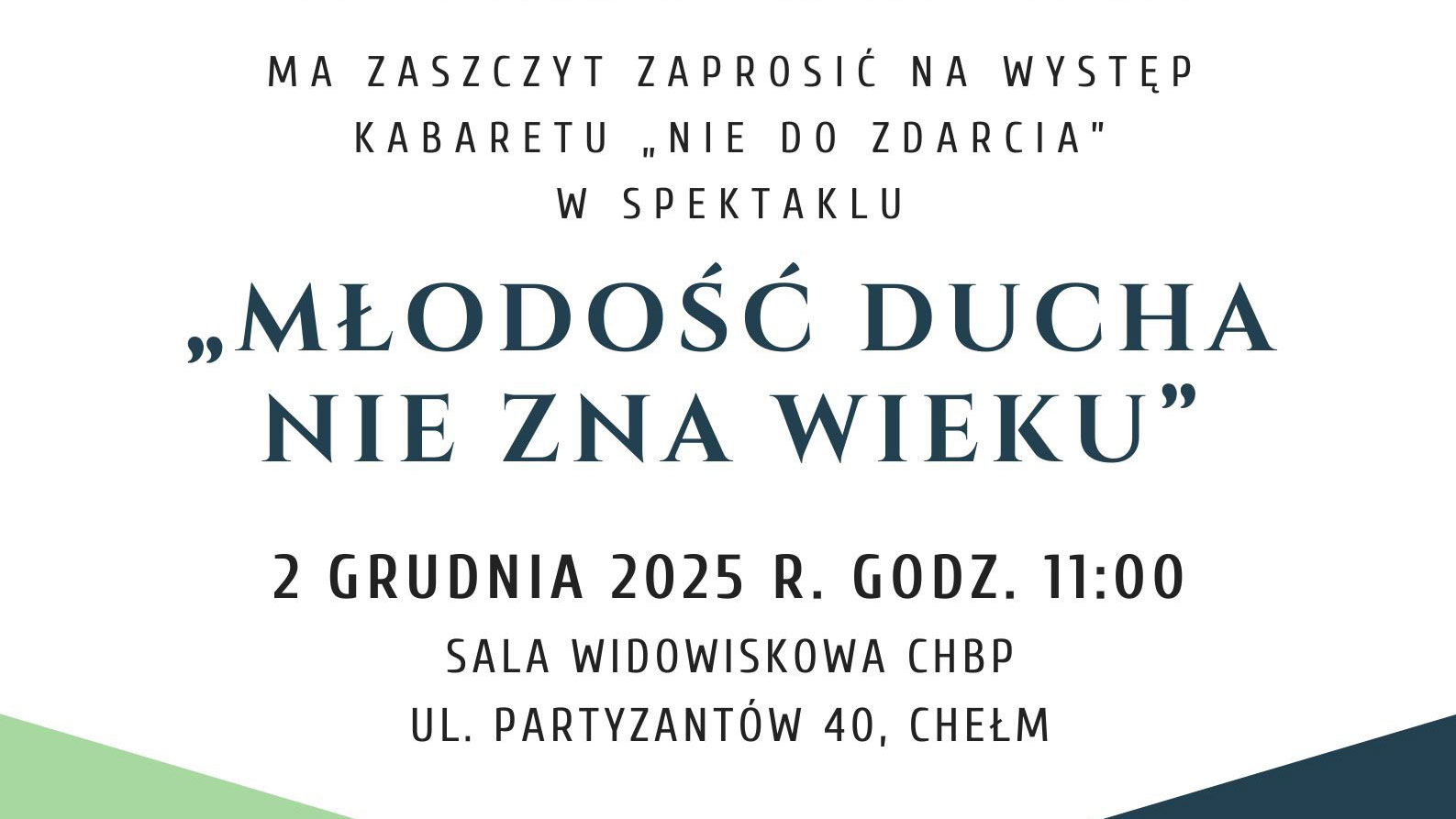 Uniwersytet Trzeciego Wieku działający przy PANS w Chełmie serdecznie zaprasza na występ Kabaretu „Nie do zdarcia” w spektaklu „Młodość ducha nie zna wieku”. To doskonała okazja, by spędzić czas w znakomitej atmosferze, pełnej uśmiechu i pozytywnej energii.